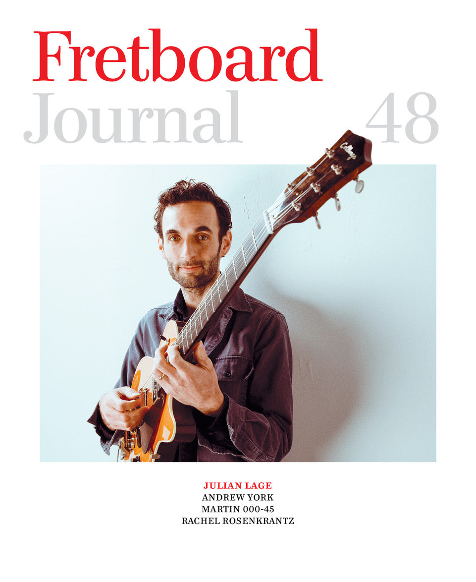Innovators and traditionalists, old and new... the 48th issue of the Fretboard Journal has a bit of everything in its 128 pages. It's now mailing to readers around the world. This time around, we have our long-overdue chat with boundary-pusher (and now Collings signature artist) Julian Lage for a conversation about inspiration, gear and more. Grammy-winning classical guitarist and composer Andrew York walks us through the many facets of his lengthy career... a feat that takes over 20 pages! We also get a peek at a pair of ultra-rare Martins: Bob Minner's pre-war D-18 that he's dubbed "Frankie," and an even rarer pre-war 000-45 brought back from the dead by Frank Ford and Gryphon Instruments. We also talk mandolins and songwriting with Chris Thile; learn about the future of consistent tone woods via Dave Olson and Pacific Rim Tonewoods; and visit the atelier of Rachel Rosencrantz, a luthier committed to finding alternatives to wood itself. Plus a lot more..