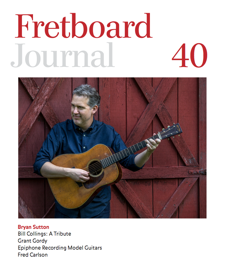 Digital (PDF) edition of the 40th issue of the Fretboard Journal (Fall 2017), with features on Bryan Sutton, Grant Gordy, luthier Fred Carlson, Pre-war Guitars Co., guitarist Steve Gunn, Epiphone Recording Model instruments and our tribute to Bill Collings of Collings Guitars. 128 pages. Printed on keepsake paper, as always.